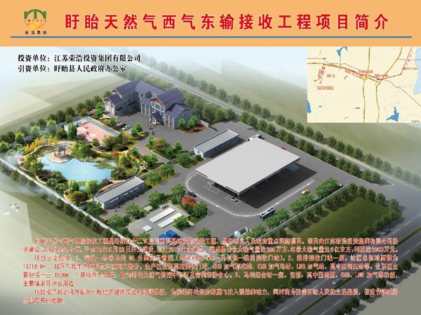 西氣東輸盱眙接收工程是盱眙縣十二五規劃重要基礎設施建設工程,是盱眙縣人民政府重點招商項目。項目由江蘇榮浩投資集團有限公司投資建設,總投資約2億元,于2012年9月28日開工建設,預計2013年底建成。建成后日最大輸氣量達200萬方,年最大輸氣量達6億立方,利稅達2000萬元。